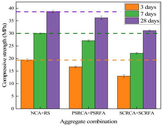 It can be observed from Figure 9 that due to the properties of aggregate, the compressive strength of SCRCA and SCRFA concrete and PSRCA and PSRFA concrete is lower than that of NCA and RS concrete. This is because the water consumption of SCRCA and SCRFA concrete and PSRCA and PSRFA concrete is higher than that of NCA and RS concrete, the compactness is lower, and they contain micro-cracks that are easily damaged []. However, the strength of each age of PSRCA and PSRFA concrete is similar to that of NCA and RS concrete, while the strength of each age of SCRCA and SCRFA concrete is quite different from that of NCA and RS concrete. The 3 day compressive strength of NCA and RS concrete is close to the 7 day compressive strength of SCRCA and SCRFA concrete, and the 7 day compressive strength of NCA and RS concrete is close to the 28 day compressive strength of SCRCA and SCRFA concrete. This is because there are numerous old cement stones and mortars on the surface of SCRCA and SCRFA, which makes the interface transition zone very weak and easily damaged after they are prepared into concrete []. After PSRCA and PSRFA are processed by particle-shaping, the cement stone and mortar on the surface have been removed. In the concrete prepared using PSRCA and PSRFA, the interface transition zone of aggregate has been strengthened to a certain extent, compared with that of SCRCA and SCRFA concrete. This is similar to the research conclusion of H.K.A. Al-Bayati [].