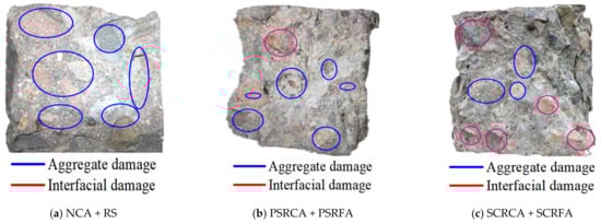 It can be observed from Figure 10 that the failure modes of the NCA and RS concrete test blocks are failures caused by the crushing of the NCA, and no interface failure between the NCA and the cement paste has been found. The failure section of the concrete test block prepared by SCRCA and SCRFA mostly occurred at the interface between the new and old mortar; most of the SCRCA remained intact without being crushed, and it did not play the role of skeleton support. However, the proportion of PSRCA crushing failure in the concrete test blocks prepared by PSRCA and PSRFA is larger than that of SCRCA and SCRFA concrete, and there is only a small amount of interface failure. This is consistent with the conclusion of the mechanical performance test. Namely: NCA and RS concrete strength > PSRCA and PSRFA, and SCRCA and SCRFA concrete strengths; the strength of NCA and RS concrete and the strength of PSRCA and RSRFA concrete are close to and far higher than the strength of SCRCA and SCRFA concrete.