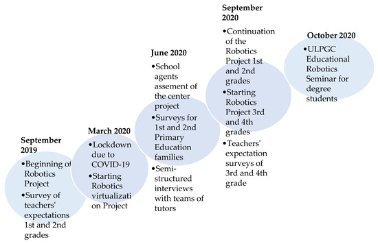 During the academic year 2019–2020 and the current 2020–2021, a Robotics and Educational Programming Project has been developed at the Claret Las Palmas center in Primary Education. This has given us an action research context with different agents: students, involved teachers, and families. We have counted on them to work with different research instruments and to evaluate the impact of the project. Furthermore, this project is integrated in the University of Las Palmas de Gran Canaria (ULPGC) Innovation Project ROBOT-EDULPGC “Design, implementation and tests of a low-cost modular platform for educational robotics”, which is part of the 2020 call for Educational Innovation projects of ULPGC. This university project has defined as its main objectives the design, implementation, and tests of an initial prototype of a low-cost modular educational robotics platform. The platform is flexible enough to be adapted, integrating different sensors and actuators, based on several education levels, taking as initial reference the levels of Early Childhood Education and Primary Education. It is a multidisciplinary project including four departments, two centers, one institute, and one research group from the ULPGC, 3 educational centers from Gran Canaria and the CEU Cardenal Herrera University in Elche (Alicante, Spain). In this sense, many actions are carried out. Consequently, a seminar on educational robotics was held with students from the university teaching profession. In this seminar, held online, the students have experimented with robotics as an educational tool, in addition to being able to see what the implication of teaching this online has. All these actions—projects in educational centers, research at the university, seminars with students, etc.—are part of the field of action of researchers. This team is made up of teachers from the school involved in the project, professors from the different named universities, and a master’s student in educational technologies who has also participated in this study.
