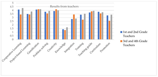As we observe in the responses obtained by the teachers shown in Table 3, the data suggest that the use of robots and elements of educational robotics in the classroom awakens the motivation of the students. Teachers agree that the use of educational robotics (ER) develops and enhances students’ creativity, being in the higher grades where it is considered that there is a greater development. In the same way, it happens with the integration of robotics as an element to work on gamification in the classroom, where 6th grade teachers consider this option very positively.