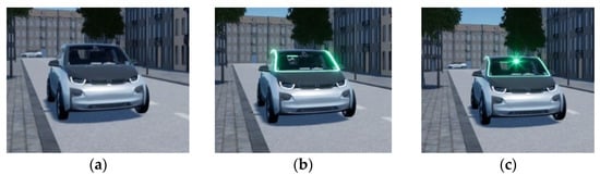 Visualization of the factor “interacting vehicle type”. (a) Non-automated vehicle; (b) AV with static eHMI; (c) AV with dynamic eHMI (example of one of the three used interaction designs, see Table 2).