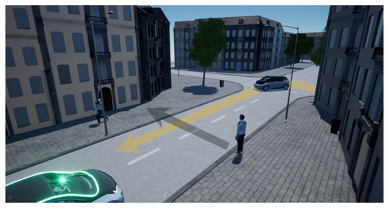 At the beginning of the urban traffic scenario, the participant stood at the street curb facing the corresponding street (see Figure 2, a). In all trials, the vehicle approached from the left (perspective of the participant). A four-way intersection was located 16.5 m to the participant’s right (see Figure 2, b). In each run, the participant stood in the same position at the beginning of a trial. One lane in each direction was presented in the VR simulation. At the end of the street and to the left of the pedestrian, a busy street crossed at a distance of about 90 m. On the opposite sidewalk, pedestrians moved to the left in the direction of the busy street. AVs and non-automated vehicles were included in the scenario, and therefore, it can be described as a mixed traffic environment, ensuring external validity.