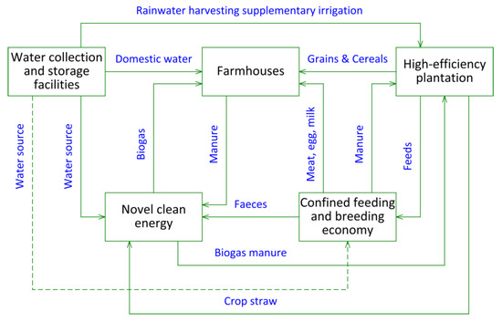 Schematic multi-level utilisation of resources and material virtuous recycling; Note: The detailed information about Figure 5 and Figure 6 can be found in Reference [28]; W He. A preliminary study on the mode of comprehensive agricultural development for poverty alleviation and ecological environment improvement in the poverty stricken mountainous areas of central and southern Gansu Province. Communication of Agricultural Science and Technology; 2008, (16): 16–7.