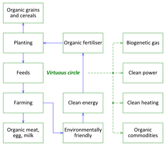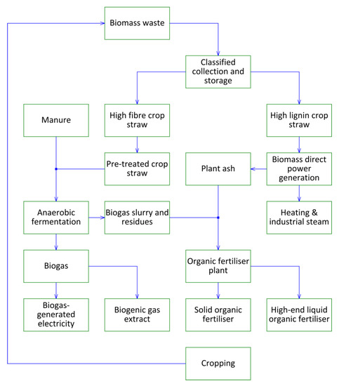 In this zone, 4958 administrative villages are involved, and the total investment in ecological construction is 19.41 billion RMB (The mentioned data come from http://www.gansu.gov.cn/col/col10/index.html, accessed on 3 February 2021.). Based on the technical route of biomass waste plus clean energy plus organic fertiliser, a complete cogeneration pattern is set up with multi-level utilisation of resources and material virtuous recycling (Figure 5 and Figure 6 [28]). The expected project operation effects can be referred to the case in the Longdong area.