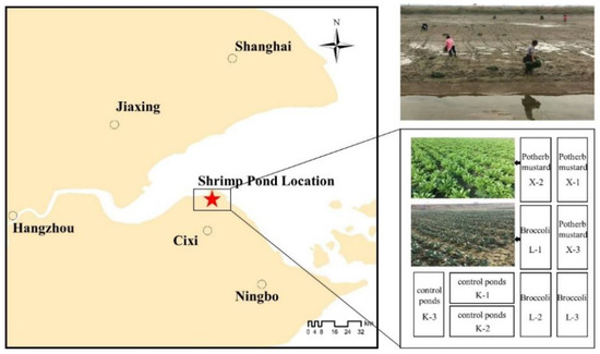 The aquaculture ponds (121°5′10″, 30°17′34″) studied in this project are located on the south bank of Hangzhou Bay, China. Broccoli (Brassica oleracea) and potherb mustard (Brassica juncea) were grown in the pond sediment over the winter (from December 2017 to April 2018) and were selected due to their short growth time, low investment, and high yield. Three ponds were selected as the control group with traditional pond maintenance (ploughing and drying), and six ponds were experimental sites treated with shrimp–vegetable rotational farming (three ponds for broccoli and three ponds for potherb mustard) as shown in Figure 1. The broccoli and potherb mustard planting density in the experimental ponds comprised 62,500 plants/hm2 and 83,250 plants/hm2, respectively. Three parallel samples were collected in each pond in December 2017, March 2018, April 2018, and August 2018, which corresponded to the four phases of vegetable planting, the mid-stage of the plant growth, post-plant harvest, and the end of shrimp farming, respectively. Sediment sampling was performed at five different pond locations using a mud picker at the plowing height of 20–30 cm with a pond water depth of typically 0.7–1.1 m. No additional fertilizers or pesticides were used during the vegetable planting. The sediment samples (approximately 1 kg) were stored in polyethylene bags and freeze-dried for 36 h, and the solid samples were ground and sieved (100 mesh size). The powder samples were saved in blue-cap glass bottles and stored at −20 °C for further extraction.