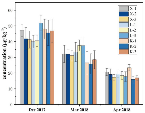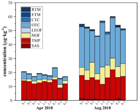 Figure 4 shows that antibiotics levels dramatically increased after a new round of Litopenaeus vannamei shrimp cultivation, to 52.70 μg/kg, 50.75 μg/kg, and 55.14 μg/kg, respectively, in the potherb mustard (X-ponds), broccoli (L-ponds), and control ponds’ (K-ponds) sediment. This major increase was mainly due to the addition of feed during the new round of cultivation. Table 4 compares the levels of MP, NOF, and OTC in pond sediment before and after the new round of shrimp cultivation, which indicates a multiple increase in those major antibiotic species in the sediment.