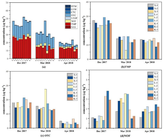 Figure 3a shows the target antibiotics speciation in the ponds with TMP, OTC, and NOF (norfloxacin) as the most abundantly detected and accounting for 90% of the total antibiotic amounts. The respective levels of the detected antibiotics changed with the testing period as shown in Figure 3b for TMP, OTC, and NOF. For instance, TMP exhibited the greatest concentration in each pond (29.33 μg/kg in L-3 ponds, 27.06 μg/kg in K-2 ponds, and 27.04 μg/kg in X-1 ponds), but decreased quickly in March by 40–50%. TMP and OTC became the most dominant antibiotics and also declined in April. Although sulfadiazine, sulfamethazine, chlortetracycline, and roxithromycin were frequently detected (exceeding 80% of the sediment samples), their concentrations were relatively low. In contrast, only half of the sediment samples were found to have sulfadiazine, sulfamethoxazole, and erythromycin with no single detection of tetracycline.