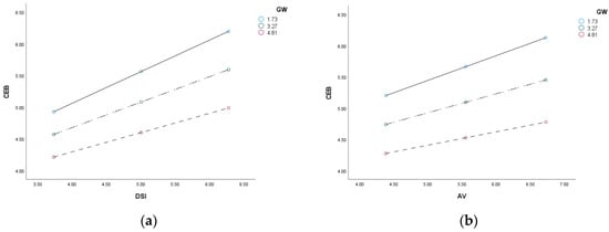 As shown in Table 6, the interaction between desired self-identity and greenwashing perception on CEB was significant, while CEB was found to be significantly related to brand loyalty (β = 0.494, p < 0.001). In order to probe the indirect effect, the conditional indirect effects at three values (mean and mean ± one standard deviation) of the moderator variable (greenwashing perception at the mean of GW = 3.27 and mean −/± one standard deviation-at 1.73 and 4.81, respectively) were estimated. At low levels of greenwashing perception (1.73), the conditional indirect effect of desire self-identity on brand loyalty via CEB was significant [effect (slope) = 0.247, bootstrap lower confidence interval (LCI) = 0.126 and bootstrap upper confidence interval (UCI) = 0.375]. At high levels of greenwashing perception, the conditional indirect effect of desired self-identity on brand loyalty via CEB was significant [effect (slope) = 0.150, bootstrap LCI = 0.073 and bootstrap UCI = 0.240]. As such, it can be inferred that the indirect effect of desired self-identity on brand loyalty via CEB is stronger at lower levels of greenwashing perception than at higher levels. Thus, H5a is supported. The slopes of the three values of greenwashing perception are displayed in Figure 2a.