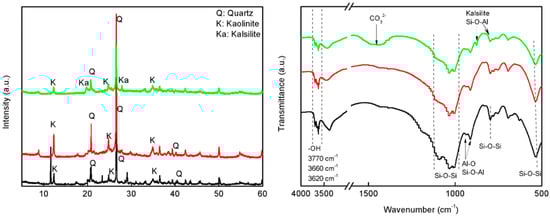 FTIR spectrum showed the typical bands of quartz and kaolinite in CCG and HCG (Figure 1 (right)). Thus, the bands assigned to O-H stretching vibration in kaolinite were found at 3700, 3660, and 3620 cm−1 [31]. Meanwhile, the Al-O and Si-O-Al vibration from kaolinite can be found at 915 and 900 cm−1. In this region of low wavenumbers, there are characteristic peaks of quartz: 1098, 1035, 1010, and 781cm–1 (Si-O-Si vibration). FTIR spectra of CCG treated with KOH showed the characteristic patterns of kalsilite, where the appearance of 987 cm−1 and 689 cm−1 peak assigned to Si-O-Al asymmetric stretching vibration in the linked (Si, Al)O4 tetrahedra [32].