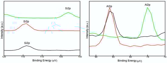 To further characterize the surface property of the prepared samples, the binding energies of C1s, O1s, Al2p, and Si2p as well as trace elements were determined by XPS (Supplementary Figure S1), a magnified view of which is shown in Figure 2. There were no significant differences in the binding energy of Al2p, Si2p in CCG and HCG, while these peaks shifted to lower binding energy in KCG. Distinct variation in peak area also revealed changes in chemical structure [33]. As compared with CCG (1/1.40) and HCG (1/1.46), the increased ratio of Al/Si (1/1.26) in KCG was caused by the minor kalsilite formation. This suggests the alkaline treatment promoted an aluminum enrichment surface, while acid modification is on the contrary. These results are consistent with reported studies [34]. Moreover, the aluminum on the surface is always regarded as the active site compared to Si, which can influence adsorption as well as related physical properties [33].