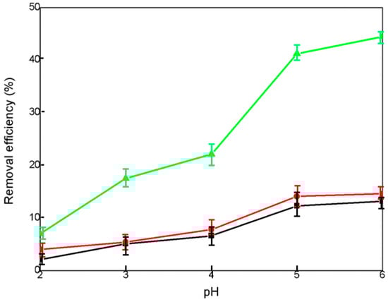 Removal efficiency (%) with 5 mg CCG (black), HCG (red) and KCG (green) adsorbents in 30 mL U(VI) (50 mg·L−1) solution under variant pH conditions (from 2 to 6).