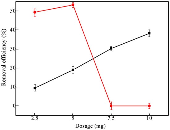 The effect of adsorbent dosage of HCG (black), and KCG (red) that influence the U(VI) adsorption.