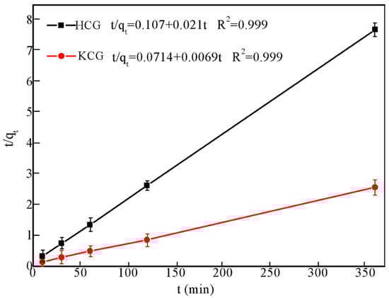 Adsorption kinetics of U(VI) on HCG (black) and KCG (red) fitted to pseudo-second-order kinetic model under pH 6.