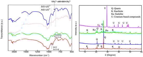 The comparison FTIR spectra before and after adsorption are shown in Figure 7 (left). The Al-O, Si-O, and Al-O-Si from kaolinite and kalsilite played an important role in the creation chemical bonding between adsorbents and U(VI), due to the disappear and/or shift of these bands together with the observation of SiO-UO22+, AlO-UO22+, and UO22+-Si-O-Al-UO22+ [40]. The kalsilite formed in KCG had strong interactions with U(VI), and thus prominently improved the adsorption capacity, which can be confirmed by PXRD.