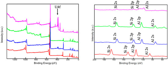 The XPS analysis before and after UO22+ adsorption of HCG (red) and after adsorption (blue), KCG (green) and after adsorption (pink). The right is the zoom in the analysis of Si and Al elements.