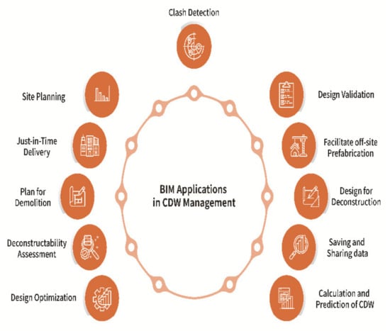 Many technological innovations, including mechanical sorting equipment, artificial intelligence, radio-frequency identification (RFID), bar code systems, geographical information system (GIS), and image processing techniques have been used to address various dimensions of waste management [61,62]. Of these, BIM is touted as the pivotal element of the system, which facilitates the integration of a coalescence of various technologies [18]. The different applications of BIM associated with waste management are well documented in the literature, of which the major ones are illustrated in Figure 1.