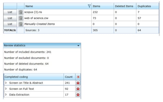 To facilitate the selection of related papers, “EPPI-Reviewer” was used, which is a tool for managing and analyzing data for research synthesis purposes. Besides this capability, this web-based application manages references, stores PDF files, removes any duplications and provides digital forms for extracting review data [81]. As illustrated in Figure 2, references from Scopus and Web of Science were imported to the program. The EPPI-Reviewer helped to identify and remove 64 duplicated papers. Afterward, 241 articles were filtered after screening their titles and abstracts. For tightening the scope, several criteria were used to reduce the number of papers. Studies had to be related to solid construction waste, hence those related to other types of waste—like oil and gas waste, water waste, or information waste—were excluded. Studies devoted to waste without using BIM were excluded. Papers that provided a theoretical framework of how BIM can help CDW management without introducing a tool were also excluded. These conditions were set in EPPI-Reviewer as the “exclude” and “include” child codes in the code set of “Screen on Full Text”. The criteria were used for setting up the screening coding tool in EPPI-Reviewer, as a result of which 92 papers were selected, providing the source of data for the next round of reviewing. To make sure that all related studies were included, references and citations of selected papers were explored too, yet no paper was added to the list.