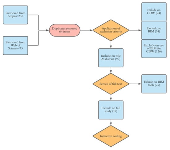 As illustrated in Figure 3, 92 studies related to BIM and CDW were identified. These were screened to select only those that introduced a workable BIM-based API or algorithm for CDW management. Out of 92, 75 did not meet these conditions and were excluded, while 17 were found to be closely aligned with the criteria and were retained for further detailed analyses (see Figure 2 and Figure 3), as discussed next.