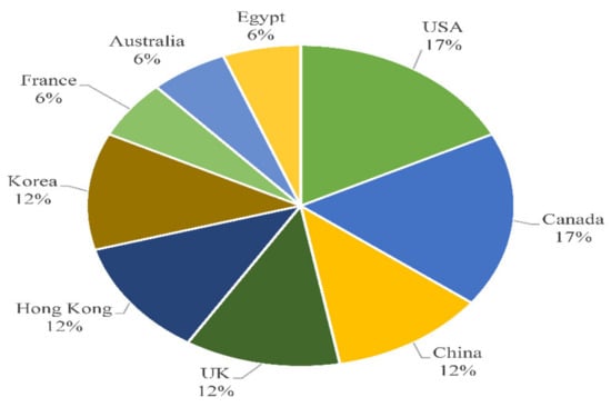 Papers were sorted according to the affiliation of their first authors, as illustrated in Figure 5. The USA and Canada (17% each) contribute the largest number of publications, followed by China, the UK, Hong Kong, and Korea (with 12% each). Australia, Egypt and France have each added 6% to the total number of publications, where other countries have played no role in this area of research. Countries like Brazil that produce sizeable amounts of CDW need to redefine research directions, to reap the benefits of BIM in managing CDW.