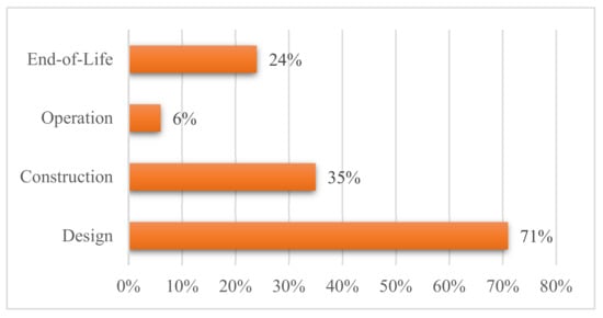 As for “life cycle”, twelve papers (71%) focused on “design”, followed by “construction” at 35%. Fewer papers considered “end-of-life” (24%), followed by “operation”, with just one paper.