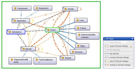 The event entity is the core of the story of near miss, without it the near miss or anomaly would not exist; therefore, its subdivision into several classes provides greater and useful specification of the concepts. The subclass loss collects the terms related to a loss of containment, e.g., leakage, overfilling, overflow; failure gathers the mentions dealt with any breakdown, malfunctioning, damage of machinery or devices, but also wrong behaviors or errors in working activities. The defects of equipment that would cause integrity problems (e.g., corrosion, erosion, pitting, holes) or less efficiency (e.g., occlusion, lack of elasticity, fouling) are grouped into the deterioration subclass. The near miss archive also contains incidents and a few accidents; thus, a subclass defines major events.