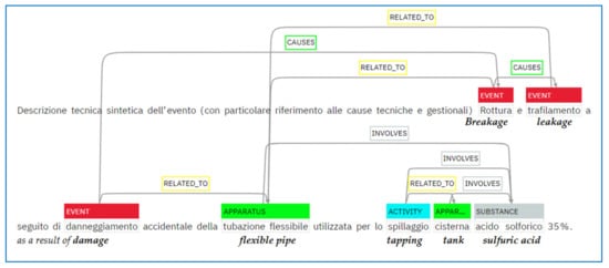The aim is not only to identify the terms but also to recognize their semantic recognition, and, above all, their relationships. The semantic recognition of the single words is not sufficient to understand the story; in fact, a term may be present in the document without having a direct role in the event. For instance, in the phrase “leakage from the drainage valve of the suction pump used for the tank”, the tank is not a primary term in the description of the near miss, so it would not be correct to count such an event as an occurrence to tank entity.