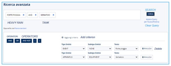 The EsOpIA application also provides the functionalities to directly query the model; the user, therefore, selects the terms from the lists of the entity types and combines them with Boolean operators. Figure 4 shows the panel of Advanced Search, the example looks for the following query: heavy rain AND tank.