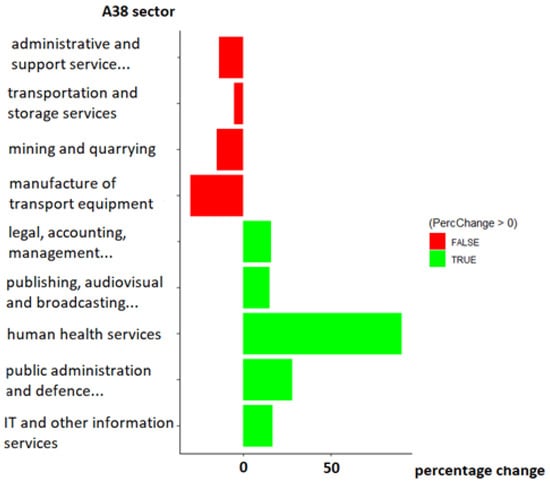 We restrict our attention on recent changes of the match, and so we measure, in each of the 38 “A38” macrosectors, the number of people with an ICT education at the beginning and at the end of a recent period of interest; in our empirical application, such period covers the years between 2013 and 2017. We then concentrate the attention on those A38 sectors which have contributed the most, in absolute terms, to the overall change in the economy. We must highlight the expression “in absolute terms”, since the overall change in the economy can result from a partial offset of strongly positive contributions, by some macrosectors, and of strongly negative contributions, by some other macrosectors.