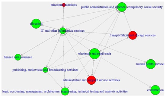 Flows of ICT-educated employees between years 2013 and 2017 (only flows of at least 50 employees are shown). The green and red colours indicate, respectively, an increase and a decrease in ICT-educated employees in the corresponding A38 economic sector. A larger node size corresponds to a higher total number of employees in the sector, independently of the employees’ education.