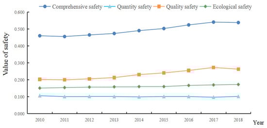 In general, the degree of security of cultivated land resources in Hubei Province showed an upward trend between 2010 and 2018 (Figure 2). The comprehensive safety value increased from 0.460 in 2010, to 0.538 in 2018, with an average annual growth rate of 1.9%. Among the various values, the value of quality safety increased from 0.203 to 0.263, and the value of ecological safety increased from 0.151 to 0.173, both showing an upward trend. Meanwhile, quantity safety showed a slight downward trend, with its value decreasing from 0.106 to 0.102; quality safety value showed a slightly decreasing trend from 2017 to 2018.