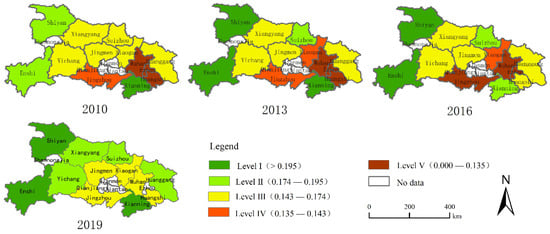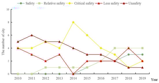 The number of cities in the ‘safety’ and ‘relative safety’ levels of cultivated land resource showed an increasing trend between 2010 and 2019; the number of cities in the ‘unsafe’, ‘lesser safety’ and ‘critical safety’ levels of SCLR showed a decreasing trend (Figure 3). In 2010, the number of ‘safety’ and ‘relative safety’ cities was 0; the number of ‘critical safety’ and ‘lesser safety’ cities was four, and the number of “unsafe cities” was five. In 2019 (excluding Ezhou), the number of ‘safety’ and ‘relatively safety’ cities had reached three and four, respectively, while the number of ‘critical safety’ and ‘lesser safety’ cities were both two. The number of ‘unsafe cities’ also decreased to one. Between 2013 and 2018, the number of ‘lesser safety’ cities increased slightly, but the overall trend was good. The comprehensive safety level in all cities showed an overall upward trend.