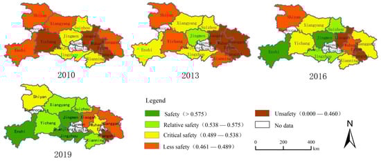 In order to reflect the spatial characteristics of SCLR in the Hubei Province more intuitively, ArcGIS software was used to analyze the spatial distribution of comprehensive security, quantity security, quality security and ecological security (Figure 4).