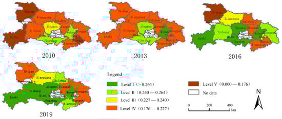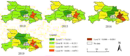 The quality safety level of cultivated land resources in the Hubei Province showed an upward trend between 2010 and 2019 (Figure 6). Most of the cities in central Hubei were at a low grade in 2010, but there would be a significant increase in the number of cities with a high quality safety level. Although the security level of eastern and western Hubei has improved, these areas are still at a lower level. The safety level in Wuhan and Jingzhou was higher, while Jingmen was in the middle level, and the rest were at a lower safety level in 2010. The safety degree of quality showed a spatial pattern of high in central Hubei and low in eastern and western Hubei. Except for Wuhan and Enshi, the areas with higher security levels were in central Hubei and Jingmen, along with Jingzhou, Yichang and Suizhou near central Hubei. Safety levels were at the medium level for Huanggang, with lower-level areas being Xiaogan, Huanggang and Huangshi in the east, and Shiyan in the west of Hubei. The city with a medium safety level was Huanggang, while the cities with low safety levels were Xiaogan, Huanggang and Huangshi in eastern Hubei, and Shiyan in western Hubei.