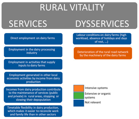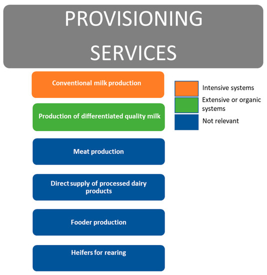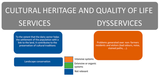 - Safeguarding of cultural heritage and traditions. The participants defined this service as the role that dairy farming plays in consolidating the rural population, ensuring that this contributes to preserving cultural traditions and historical heritage (related in part to farms). Included in the sub-service of preserving cultural traditions, reference was made to the terminology associated with agricultural and livestock activity, work implements and techniques, and the production of native plant varieties and animal breeds. Participants considered that this activity contributes to the transmission of skills and knowledge from generation to generation by consolidating the rural population.