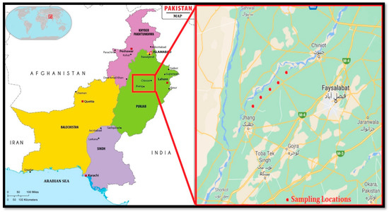 Agronomic fields in Jhang district were chosen as a study area (Figure 1). Jhang is located in Punjab province, Pakistan. Most of the land, almost 8809 km2, is agronomic, excluding the area near the Chenab River. The district receives an average of 150 mm (https://jhang.punjab.gov.pk/climate, accessed on 29 July 2021) annual rainfall, with irregular rainfall taking place in winter. Five agricultural sites were carefully selected near the side of Moza Satiana Chiniot road to investigate metal contents in randomly collected basmati rice (grain, root and shoot) and soil samples. All sites were selected to determine the level of contamination in rice crops due to canal water irrigation.