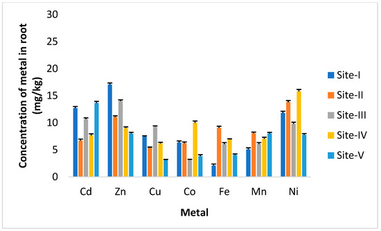 Figure 3. Variation in concentration of heavy metals in plant roots at the five sites.