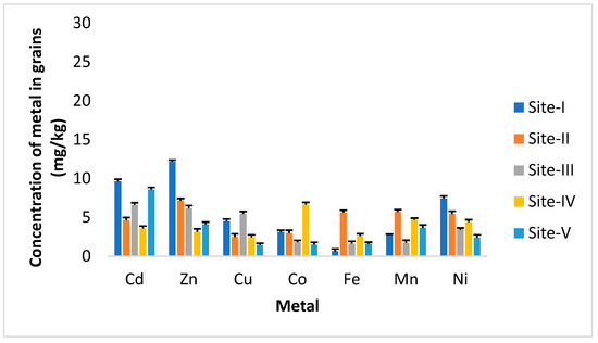Examination of variance indicated significant influence of sites on element concentration (Cu, Ni, Co, Fe, Cd, Zn and Mn content) in Basmati grains (Table 2). In grains, the levels of Cu and Co were the highest, while Ni was low at all sites (Figure 5).