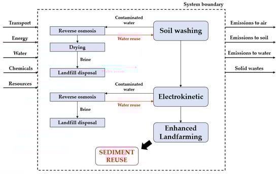 System boundaries included all the materials and processes involved in the treatment steps, from sediment transport to the treatment site, to reuse and/or dispose of landfill (Figure 1). The final allocation of the sediments depended on the assumptions made in the scenarios and treatments supposed for the contaminant removal. In particular, this study considered three treatment technologies for soil remediation: soil washing (SW), electrokinetic treatment (EK) and enhanced landfarming (EL). These technologies may be combined among them, as they remove different categories of contaminants, and their use may depend on the sediment particle size. Figure 2 shows the action plan followed for this project, explaining the decision-making process adopted and the characteristics of the treatment technologies considered. As mentioned, it should be noted that contaminant removal was not always allowed due to the limited effectiveness of the treatment technologies considered, and this led to the recovery or landfill disposal of sediment fractions, based on the technologies available. Obviously, even the untreated fractions may be recovered through different technologies not included in this project, such as phytoremediation [,].