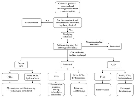 Treatment of contaminated marine sediments can be achieved by means of several technologies, most of which are related to soil remediation [,]. The available treatment technologies differ in characteristics, and their use depends on sediment properties, such as particle size and type of pollution [,]. Therefore, we considered three treatment technologies, which may be combined among them, to treat sediments polluted by potentially toxic elements (PTEs) and organic compounds, namely: soil washing (SW), electrokinetic (EK) treatment and enhanced landfarming (EL).