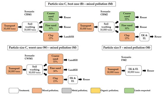 Instead, considering the worst contaminant distribution, the so-called worst case, both sand and clay fractions were found to be contaminated after SW treatment. In this case, the only possible scenario was to recover the clay fraction and dispose of the sand fractions in landfill, since it is not possible to remove PTEs. Indeed, while hydrocarbons could be removed from fine sand fraction by EL, EK treatment cannot be applied to both sand fractions, as it requires low-permeability soils [].