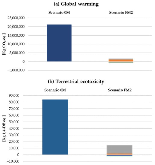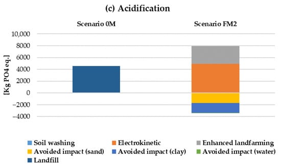On the other hand, although the avoided impacts are considerable (all sediments are recovered), in the scenario FM2, acidification is not an advantageous indicator, because of the high contributions given by EL and, above all, EK (Figure 4). In particular, the greatest impacts are due to the energy consumption in EK and the use of wood chips as bulking material in EL. Therefore, even if all sediments are recovered, treating 30,000 tons of sediments by EK and EL requires high consumptions and negatively affects acidification.