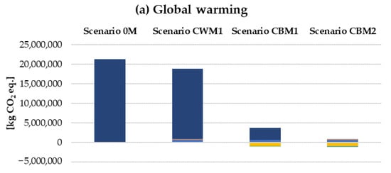 Finally, each scenario was compared with the corresponding reference scenario, consisting of the landfilling of sediments without any treatment, namely, Scenario M0, Scenario H0 and Scenario O0. It should be noted that potential environmental impacts due to the landfill disposal of sediments depend exclusively on the total amount of contaminated sediments discharged to landfill and, therefore, reference scenarios were independent of the other parameters.