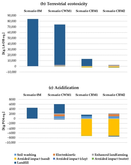 Concerning Scenario CWM1, the contribution analysis of acidification (Figure 5) shows that the highest impact is due to landfill disposal of the sand fractions, while avoided impacts due to recovery of the clay fraction and water are negligible. In fact, because of the worst contaminant distribution after SW treatment, in the scenario CWM1, only clay fraction can be recovered, which represents 15% of the sediment with particle size C. Scenarios CBM1 and CBM2 confirm that acidification is strongly influenced by avoided impacts, as the recovery of large quantities of sediments makes these scenarios particularly advantageous, despite the fact that the treatment of 30,000 tons of sediments generates non-negligible environmental impacts.