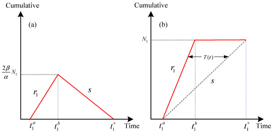 We firstly consider the extreme case with or , which is called as benchmark pattern 1 to distinguish it from the pattern of . As analyzed above, there are only early bird drivers including in the commuting corridor when . We make , as the earliest and latest departure time for EBDs, respectively. Differentiating Equation (5) with respect to and setting to zero, , the equilibrium departure rate from home for EBDs who arrive at the parking place before the desired arrival time can be given by: