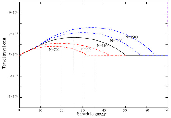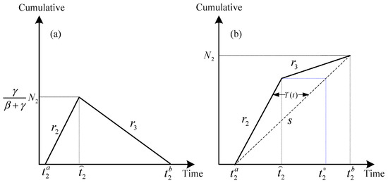 According to the descriptions in Table 2 and Figure 3, can be determined (shown in Figure 3b), , when the total travel demand is , meanwhile , , when the total travel demand is . The derivations of this value are shown in Appendix B and Appendix C.