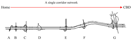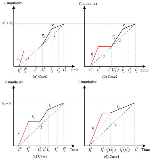 - Without loss of generality, assuming , , we can regard the length of bottleneck as the distances of OD pair in the single corridor; meanwhile, the departure time from the origin is equal to the arrival time at bottleneck, and the exiting time of the bottleneck is equivalent to the arrival time at CBD.