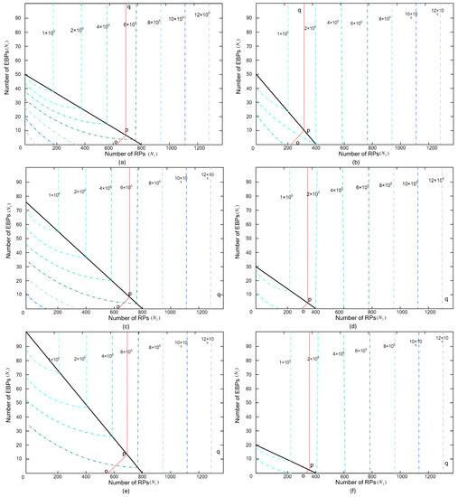 In this section, we discuss the effect of morning traffic congestion (bottleneck capacity) on morning commuters’ parking choice behavior when the parking schedule gap and parking pricing gaps are fixed. Due to this objective, we exemplify the occurrence of () when the system achieves UE in different cases, as detailed in Table 4. With the fixed parking schedule gap and parking pricing gap , Figure 5 clearly illustrates the domains of occurrence for all different cases shown in Table 5 with respect to different values of and . The solid black line represents the optimal allocation of commute demand () among different cases, which can be indicated from Section 5. We know that , when the total travel demand (upper part of solid black line), and , , when the total travel demand (left lower part of solid black line). The red line op shows the occurrence of () when the system achieves UE in the case of ; meanwhile, the red line pq indicates the occurrence of () when the system achieves UE in the case of . Figure 5a,c and Figure 6e show that the occurrence of early bird parkers increases with the increasing of the parking pricing gap when the parking schedule gap is fixed, which can be shown in Figure 5b,d,f. Figure 4a and Figure 5b show the occurrence of early bird parkers increases with the decreasing of the parking schedule gap when the parking pricing gap is fixed.