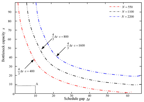 When parking demand is larger than standard parking schedule gap (), satisfies Equation (A6), then the system has the same user equilibrium pattern with the case of . The total travel time after UE is and according the definition of the increasing rate in parking management revenue, . When , the travel cost of regular parkers is always more expensive than the travel cost of early bird parkers, and all commuters will select the early bird schedule as the potential travel pattern. No one departs from home after time until ; here, the cost of EBPs and RPs are equal and these two groups of commuters depart from home independently without a mixed pattern. According to Theorem 3, we can acquire the relationship between EBPs and RPs when the parking schedule is fixed (which can be regarded as zero without loss of generality):