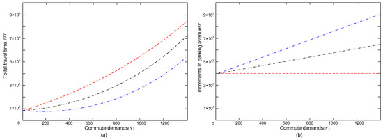 This section discusses the effect of total commute demand on the total travel time and increases in parking revenue when parking schedule gap and bottleneck capacity is fixed. Given parking schedule gap , and bottleneck capacity s = 10 (veh/min) according to the assumption and some related knowledge in Section 6.1 and Section 6.2, it is easy to obtain the optimal parking demand . In order to analyze the effect of parking pricing gap on the travel time of system, we introduce three cases of when total travel demand : (the red line in Figure 7), (the black line in Figure 7) and (the blue line in Figure 7), the detail of the relationship between total travel time and parking demands are shown in Figure 7a; meanwhile, the increases in total parking revenue and parking demands are shown in Figure 7b. The number of regular parkers is 800, and the left is early bird parkers when . We further see that total travel time increases with the parking demand, but the sensitivity of total parking demand for total travel time in different cases of is different. The increment rate in total travel time decreases with the decrease of . For the increment in parking revenue shown in Figure 7b, the increment in parking revenue increases with the varying parking demand, and the increment rate increases with . The system achieves maximum and the minimum total travel time when . This means that the scientific arrangement of the parking pricing strategy can help to reduce traffic congestion and increase the revenue of parking managers. These properties is also shown in Figure 8.