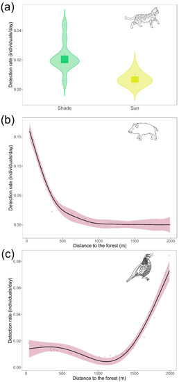 Significant results from the Generalized Additive Models (GAMs) shown in Table 2. Data are based on detection rates from camera traps in 23 coffee home gardens in an agroforestry environment in West Java, Indonesia. Shaded areas represent 95% CI. (a): We encountered Sunda leopard cats more frequently in shade-grown gardens than in sun-exposed gardens (represented via box plots embedded in violin plots); (b): We encountered wild boar in gardens up to 500 m from the forest (represented via smooth term from GAM results); (c): We detected barred buttonquail more frequently at distances further than 1500 m from the forest.